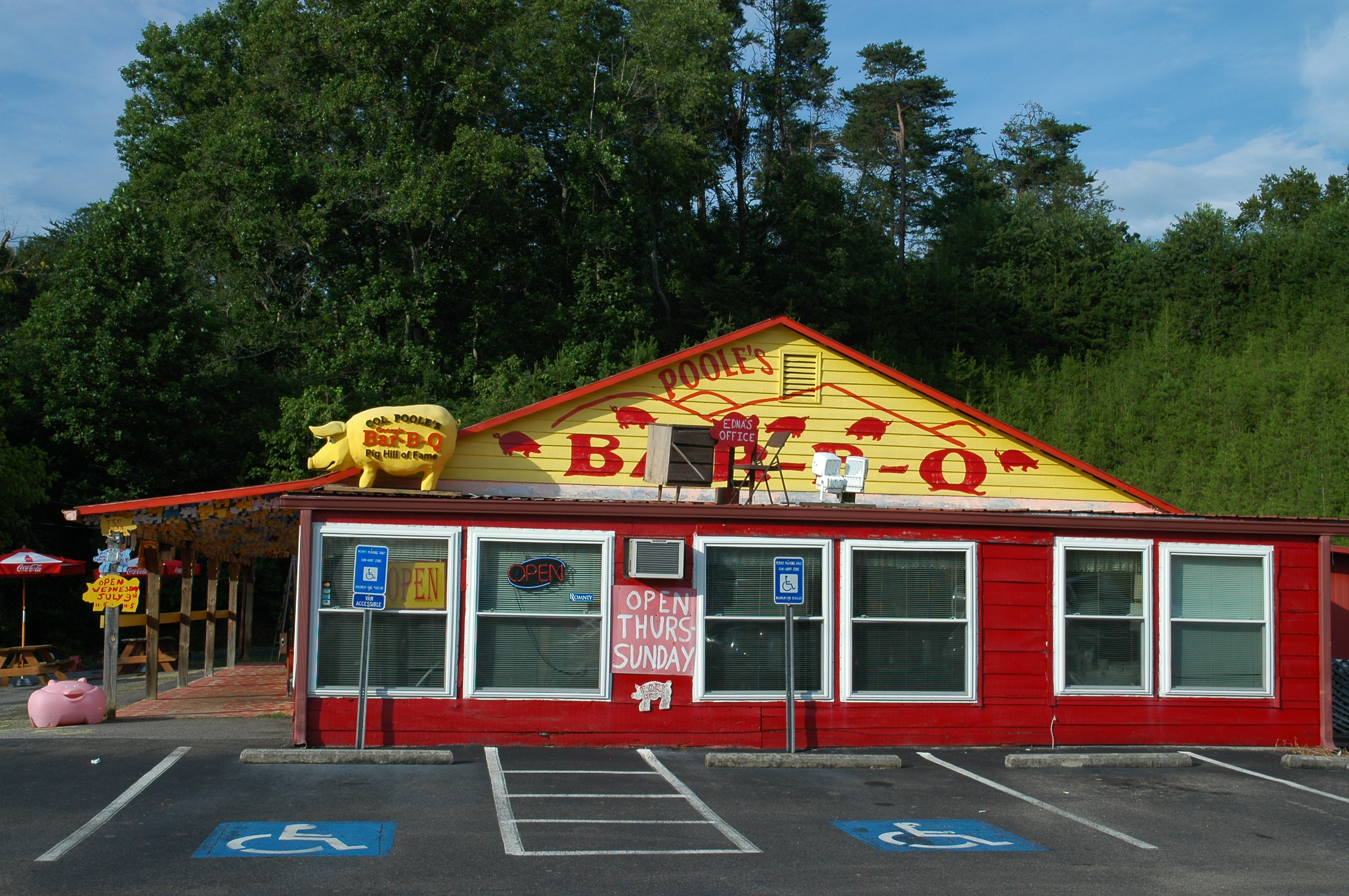 This is Poole’s BBQ. From this picture, it appears to be a fairly standard bbq restaurant. The yellow pig on the top, with the restaurant’s name painted on his side, and the multiple painted pigs on the yellow siding, are nothing out of the ordinary. The yellow pig sign on the post with the restaurant’s July 3rd hours is a nice touch, though a bit out of season since we visited in August. The plastic pink pig bin–which to me looks like a Little Tykes toy box–is really the first hint to me that this place is a little unusual. Just how unusual is Poole’s? Come back tomorrow to find out!